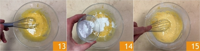 Mélangez avec le fouet 13, puis incorporez la fécule de maïs et la fécule de riz 14 et mélangez bien le tout 15.