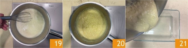 Faites cuire la crème à feu moyen, en remuant constamment 19, jusqu'à ce qu'elle épaississe 20. Versez la crème dans un plat 21, couvrez-la avec du film plastique au contact et laissez-la refroidir à température ambiante pendant 30 minutes. Ensuite, transférez-la dans une poche à douille sans embout et placez-la au réfrigérateur pendant au moins 3 heures.
