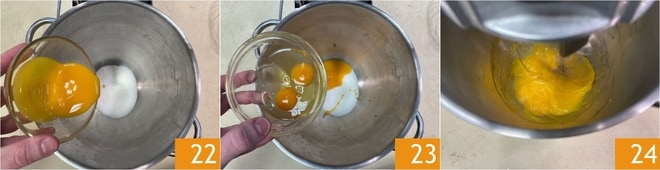 Pour préparer le biscuit génoise, versez dans le bol du robot, muni de fouets électriques, le sucre, les jaunes d'œufs 22, les œufs entiers 23 et une pincée de sel. Fouettez pendant au moins 10 minutes 24.