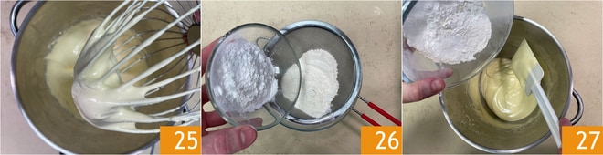 Vous devez obtenir un mélange clair et mousseux 25. Dans un bol à part, tamisez la farine et la fécule à deux reprises 26, puis incorporez les poudres petit à petit au mélange monté, en mélangeant délicatement avec une spatule de bas en haut pour ne pas le faire retomber 27.