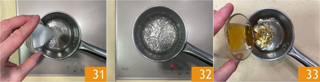 Pour préparer le sirop, versez dans une casserole l'eau et le sucre 31, puis portez à ébullition 32. Retirez du feu et laissez refroidir complètement. Une fois le sirop refroidi, ajoutez le rhum 33 et mélangez.