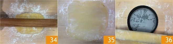 Après avoir laissé reposer la pâte sablée au réfrigérateur, étalez-la avec un rouleau à pâtisserie sur un plan de travail fariné 34 jusqu'à obtenir une épaisseur d'environ 5 mm 35. Beurrez et farinez un moule de 25 cm de diamètre, d'au moins 3,5 cm de hauteur, et tapissez-le avec la pâte sablée, en l'enroulant d'abord sur le rouleau à pâtisserie puis en la déroulant sur le moule 36.