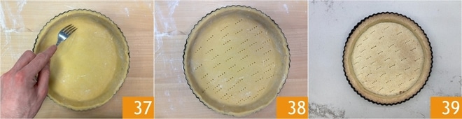 Faites adhérer la pâte au fond et aux bords, puis découpez l'excédent de pâte et piquez le fond avec une fourchette 37. Faites cuire dans un four statique préchauffé à 175°C pendant environ 30 minutes 38. Une fois cuite, laissez refroidir complètement la base 39.