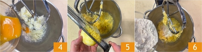 Ajoutez les jaunes d'œufs 4 et le zeste de citron 5, mélangez bien, puis incorporez la farine 6 et continuez à pétrir.