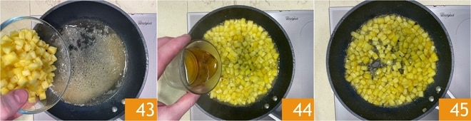 Ajoutez l'ananas 43, déglacez avec le rhum 44 et faites cuire à feu doux jusqu'à ce qu'il soit légèrement caramélisé 45.