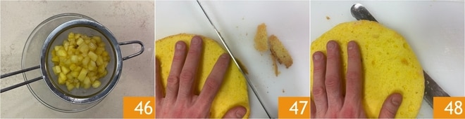 Égouttez les cubes d'ananas et laissez-les refroidir complètement 46. Pendant ce temps, avec un couteau à dents, retirez la croûte extérieure du biscuit génoise 47. Coupez le biscuit génoise horizontalement en deux pour obtenir un disque d'une épaisseur de 1 cm 48.