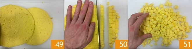 Vous obtiendrez ainsi 2 disques 49. Coupez un disque en cubes d'environ 1 cm 50, afin de créer les fleurs de mimosa 51.