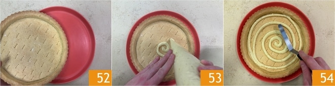 Placez la base de pâte sablée refroidie sur un plat de service 52, puis répartissez la moitié de la crème pâtissière au fond 53 en l'étalant avec une spatule 54.