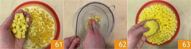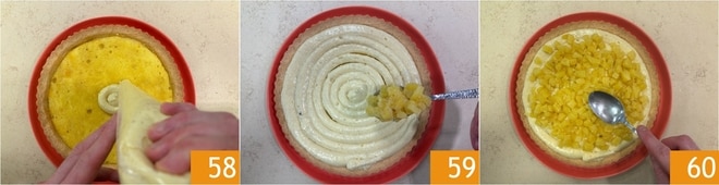 Répartissez le reste de la crème pâtissière 58, puis ajoutez les cubes d'ananas caramélisés 59 et nivelez le tout avec le dos d'une cuillère 60.