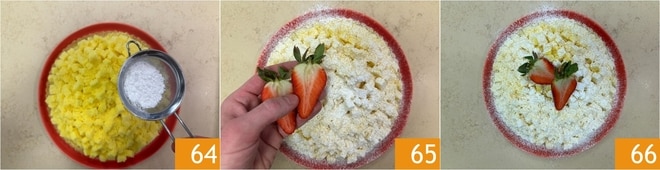 Complétez avec le sucre glace 64 et une fraise fraîche coupée en deux 65. Laissez reposer au réfrigérateur pendant au moins 2 heures avant de servir votre tarte mimosa 66 !