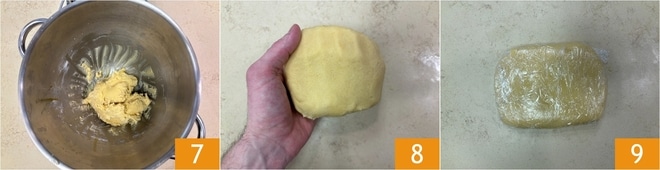 Vous devez obtenir une pâte compacte et homogène 7. Formez une boule 8, enveloppez-la dans du film plastique 9 et laissez reposer au réfrigérateur pendant au moins 3 heures.