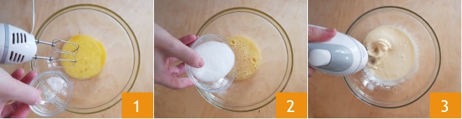Commencez par préparer la base de la tarte moelleuse. Versez l'œuf dans un bol et incorporez la pincée de sel 1 et le sucre 2 tout en fouettant avec un batteur électrique. Continuez jusqu'à ce que le mélange soit bien monté 3.