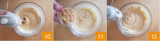 Mélangez bien le tout, en actionnant le batteur électrique à basse vitesse 10, et incorporez la farine de noisettes en plusieurs fois 11, en continuant à travailler avec le batteur pour l'incorporer 12.