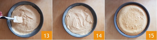 Beurrez et farinez un moule à tarte renversée de 28 cm et versez-y la pâte en nivelant la surface avec une spatule 13 14. Faites cuire dans un four statique préchauffé à 180°C pendant 30 minutes sur la grille du milieu. Une fois cuite, sortez-la du four 15 et laissez refroidir.