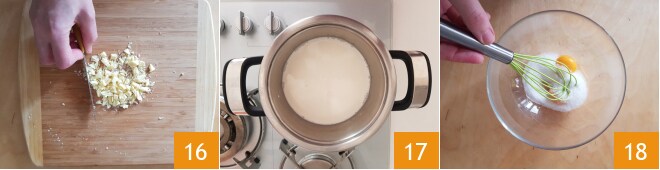 Pendant que la tarte cuit au four, préparez la crème au chocolat blanc. Hachez grossièrement le chocolat blanc 16. Faites chauffer le lait 17. Pendant ce temps, dans un bol, mélangez les jaunes d'œufs avec le sucre et remuez avec un fouet à main 18.