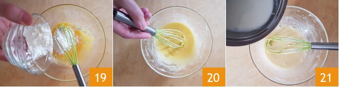 Ajoutez également l'amidon de maïs 19 et mélangez 20. Versez la moitié du lait chaud dans le mélange d'œufs 21. Mélangez bien avec un fouet afin d'éviter les grumeaux et ajoutez le reste du lait.