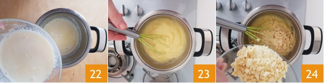 Transférez le mélange à nouveau dans la casserole 22 et portez à ébullition, en remuant continuellement avec un fouet à main, jusqu'à ce que la crème épaississe 23. Éteignez le feu et ajoutez le chocolat blanc en morceaux 24, mélangez bien jusqu'à ce que le chocolat soit complètement fondu.