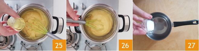 Ajoutez le limoncello 25, mélangez encore jusqu'à ce qu'il soit complètement incorporé 26. Transférez dans un bol, couvrez avec un film alimentaire au contact et laissez refroidir, d'abord à température ambiante puis au réfrigérateur. Pendant ce temps, préparez également le sirop : dans une casserole, versez l'eau et le sucre 27 et chauffez sur le feu jusqu'à ce qu'il soit complètement dissous.