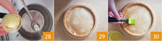 Éteignez le feu et ajoutez le limoncello 28. Lorsque toutes les bases seront froides, reprenez la tarte moelleuse 29 et imbibez-la avec le sirop fraîchement préparé en utilisant un pinceau de cuisine 30.