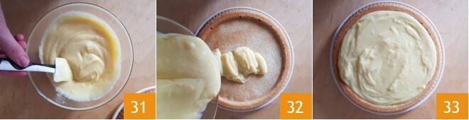 Reprenez la crème et travaillez-la avec une spatule jusqu'à ce qu'elle soit lisse 31. Transférez-la à l'intérieur de la tarte 32 et nivelez avec une spatule 33.