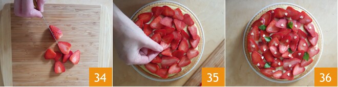 Lavez bien les fraises, retirez le pédoncule et coupez-les en tranches 34. Utilisez-les pour décorer la tarte 35, garnissez avec les pépites de chocolat et les feuilles de menthe 36. La tarte moelleuse avec crème au chocolat blanc et fraises est prête : servez-la ou conservez-la au réfrigérateur.