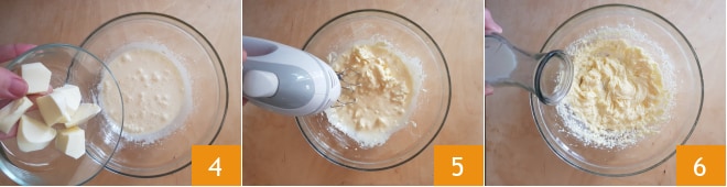 Ajoutez le beurre mou en morceaux 4 et continuez à battre 5 jusqu'à obtenir une pâte lisse et homogène. À ce stade, ajoutez le lait à température ambiante 6.