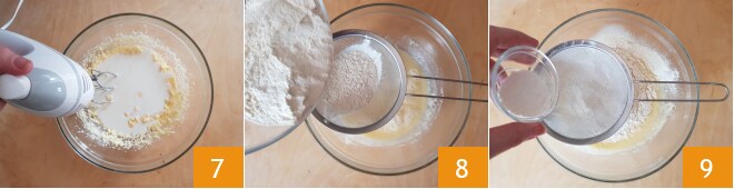et mélangez le tout toujours avec le batteur électrique 7. Tamisez à l'intérieur la farine T45 8 ainsi que la levure chimique 9.