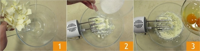 Pour préparer la tarte moelleuse (base), dans un bol, versez le beurre mou en morceaux 1 et commencez à le travailler avec un batteur électrique. Dès qu'il est ramolli, ajoutez le sucre 2 et continuez à fouetter jusqu'à obtenir une texture crémeuse. Ajoutez le premier œuf 3 et travaillez avec le batteur électrique jusqu'à ce qu'il soit bien absorbé.