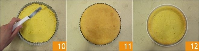 Versez-le maintenant dans un moule astucieux de 22 cm, préalablement beurré, et nivelez-le avec une spatule en coudée 10. Enfournez dans un four statique préchauffé à 180° pendant environ 25 minutes. Une fois la tarte prête, sortez-la du four et laissez-la tiédir à température ambiante 11. Lorsqu'elle est complètement froide, vous pouvez la renverser sur une assiette 12 et la garnir comme vous le souhaitez !