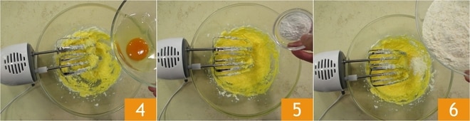 Ajoutez ensuite le deuxième œuf 4 et travaillez jusqu'à ce qu'il soit également complètement incorporé. Ajoutez maintenant la levure 5 et une partie de la farine 6. Mélangez à nouveau avec le batteur électrique.