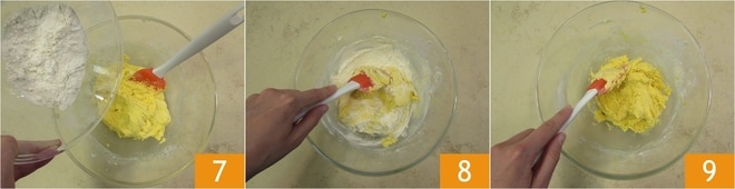 Ajoutez ensuite le reste de la farine 7 et mélangez avec une spatule 8, jusqu'à obtenir un mélange homogène 9.