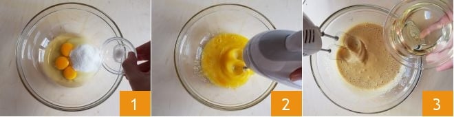 Pour préparer la tarte molle au café, préparez d'abord ce dernier avec la cafetière moka (il en faudra 50 g) ; une fois prêt, laissez tiédir. Pour la base, versez les œufs dans un bol, ajoutez le sucre et le sel 1. Montez le tout avec un batteur électrique 2 jusqu'à ce que les œufs deviennent mousseux. Cela prendra environ 6 minutes. À ce stade, continuez à battre tout en ajoutant l'huile de graines 3