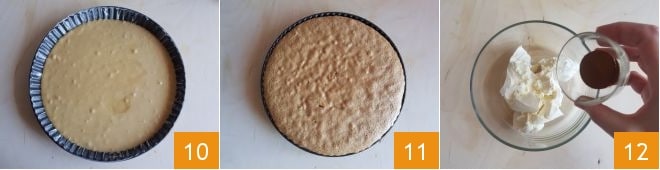 Beurrez un moule à tarte de 28 cm et versez la pâte à l'intérieur 10. Faites cuire dans un four statique préchauffé à 180° pendant 30 minutes. Faites le test du cure-dent, sortez la tarte du four 11 et laissez-la refroidir légèrement. Pendant ce temps, préparez la crème. Dans un bol, versez le mascarpone, le café soluble 12