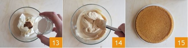 et 80 g de sucre glace 13. Mélangez le tout jusqu'à obtenir une crème lisse 14 et placez-la au réfrigérateur. Retournez la tarte sur un plat de service et laissez-la refroidir complètement 15.