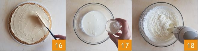 Une fois refroidie, reprenez la crème et étalez-la dans toute la cavité du dessert 16. Montez ensuite la chantilly avec le reste des 50 g de sucre glace (17-18) et transférez-la dans une poche à douille sans embout.
