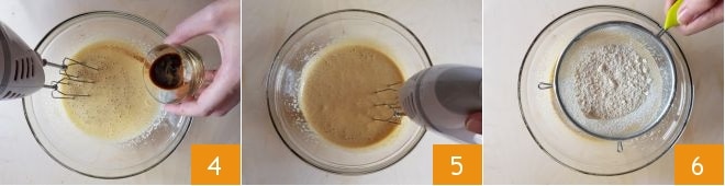 et le café désormais tiède 4. Mélangez encore quelques instants 5 puis éteignez le batteur. Ajoutez ensuite la farine tamisée 6,