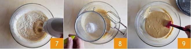 incorporez-la avec les fouets 7 et ajoutez enfin la levure 8. Actionnez à nouveau les fouets jusqu'à obtenir un mélange lisse et homogène 9.