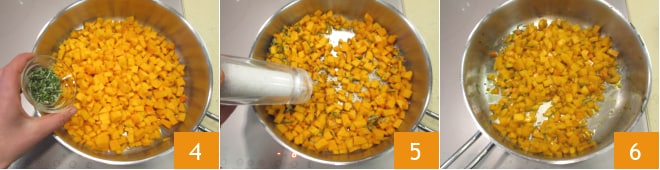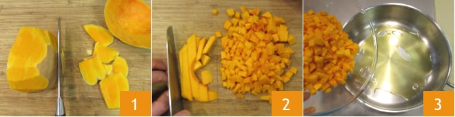 Pour préparer la tarte salée à la courge, commencez par enlever la peau de la courge avec un couteau 1, puis coupez la chair en cubes d'environ 2 cm 2 : vous aurez besoin d'environ 465 g de courge nettoyée. Faites chauffer l'huile dans une poêle et ajoutez la courge en cubes 3.