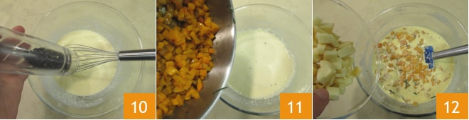 Salez et poivrez 9, puis ajoutez la courge tiédie 11 et la scamorza 12 et mélangez bien pour amalgamer le tout.