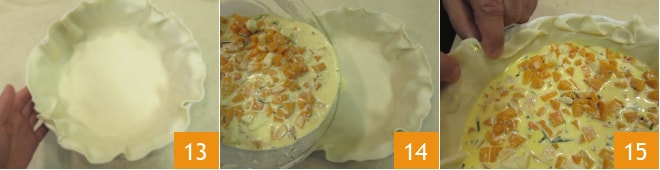 Déroulez la pâte feuilletée et placez-la dans un plat de 22 cm de diamètre à la base et 26 cm en surface 13. Versez le mélange obtenu à l'intérieur 14 et repliez le bord de la pâte feuilletée pour créer un motif décoratif 15.
