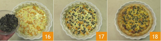 Enfin, répartissez les graines de courge sur la surface 16, puis faites cuire au four statique préchauffé à 180° pendant environ 60 minutes, en plaçant la tarte sur la grille du bas 17. Une fois cuite, laissez reposer votre tarte salée à la courge pendant 10-15 minutes avant de servir 18 !