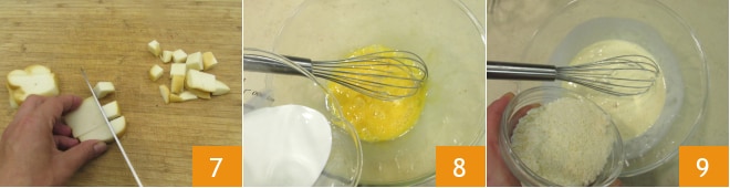 Entre-temps, coupez la scamorza en cubes 7. Maintenant, battez les œufs dans un bol, ajoutez la crème 8 et le Grana râpé 9.