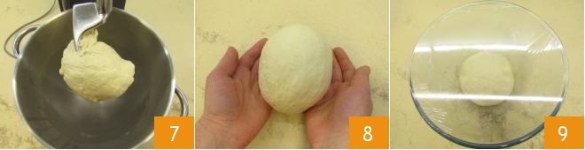 La pâte sera prête lorsqu'elle aura complètement absorbé l'huile 7, sortez-la du robot, donnez-lui une forme sphérique avec les mains 8 et placez-la dans un grand bol légèrement huilé. Couvrez avec un film plastique 9 et laissez lever la pâte dans le four éteint avec la lumière allumée jusqu'à ce qu'elle ait triplé de volume, cela prendra environ 2 heures.