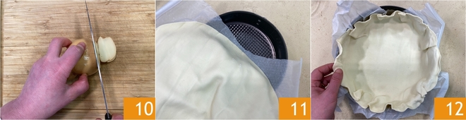Coupez la scamorza en fines tranches 10. Vous êtes prêt à monter la tarte salée : déroulez la pâte feuilletée ronde et déposez-la dans un moule de 22 cm de diamètre avec du papier cuisson 11. Veillez à bien faire adhérer la pâte aux bords du moule 12.