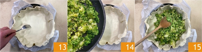 Piquez le fond de la pâte 13, puis garnissez avec les brocolis cuits 14 et égalisez avec une cuillère 15.