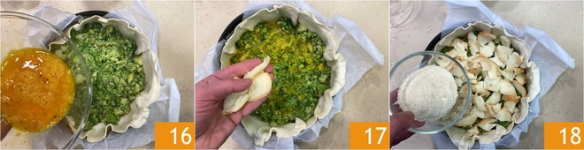 Versez aussi les œufs battus 16, puis répartissez les tranches de scamorza sur la surface 17 et saupoudrez de Parmigiano Reggiano râpé 18.