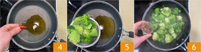 Chauffez une poêle antiadhésive avec un filet d'huile, une gousse d'ail et un piment frais 4. Au bout des 15 minutes de cuisson, égouttez et transférez les brocolis dans la poêle 5. Ajoutez les anchois 6 et faites cuire environ 6-7 minutes.