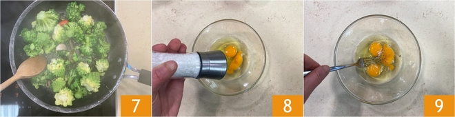 Mélangez bien, les brocolis doivent se défaire 7. Dans un bol, versez les œufs et assaisonnez de sel et de poivre 8, puis battez-les à la fourchette 9.