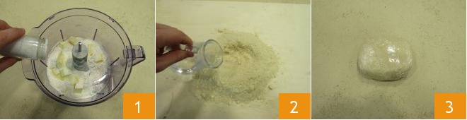 Pour préparer la tarte salée aux champignons et lentilles, commencez par la pâte Pâte brisée. Dans le mixeur, versez la farine, le beurre froid coupé en morceaux, une pincée de sel 1 et mixez le tout jusqu'à obtenir une consistance sableuse. Transférez la pâte farineuse sur un plan de travail et pétrissez brièvement en ajoutant, petit à petit, l'eau froide 2. Travaillez-la le moins possible, afin de ne pas faire fondre le beurre, jusqu'à obtenir une pâte compacte et élastique. Enveloppez le pâton avec du film plastique et laissez reposer au réfrigérateur pendant au moins 40 minutes 3.