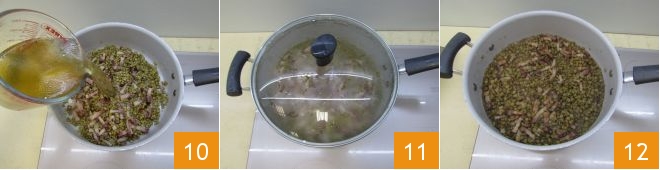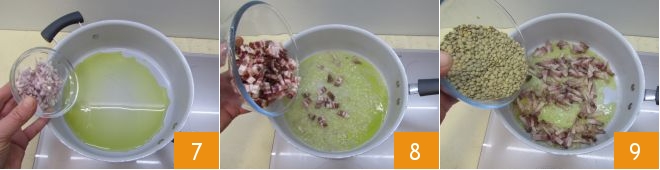 Dans une grande poêle, versez de l'huile et faites cuire l'échalote à feu très doux 7 en la faisant suer pendant 7-8 minutes, n'oubliez pas de remuer de temps en temps. Puis ajoutez la poitrine fumée en cuisant pendant 3-4 minutes 8. Lorsque le fond sera bien cuit, vous pourrez verser les lentilles sèches 9.